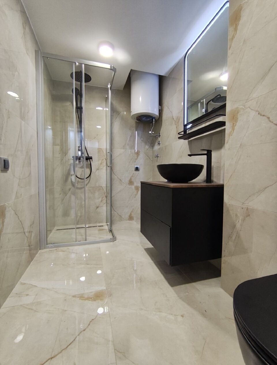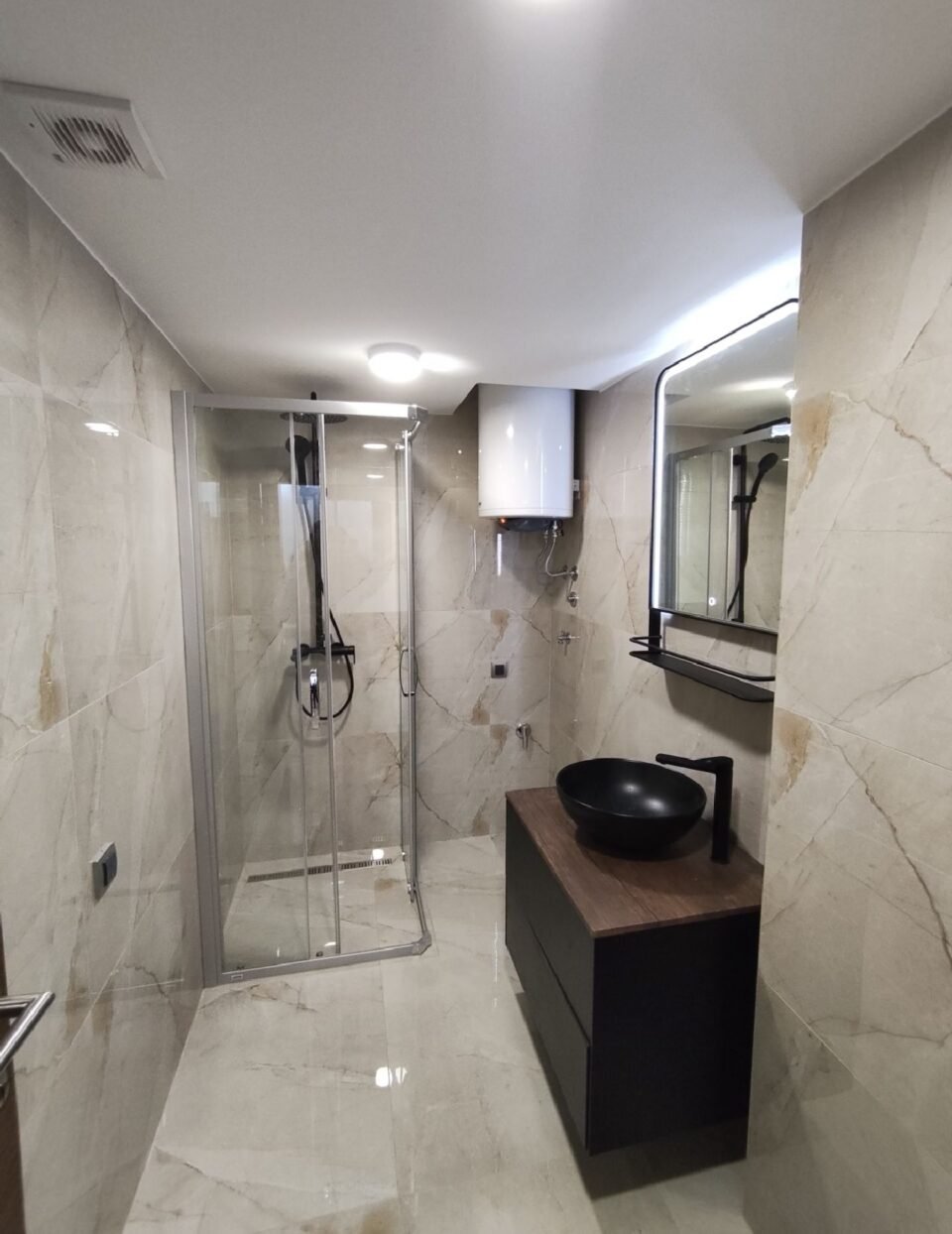Potpuno je renovirano kupatilo, elektro i vodovodne instalacije su nove, novi podovi – dezen americkog oraha, Bosal ulazna vrata, sobna vrata od furniranog medijapana – američki orah, italijanska keramika i sanitarije, aluminijumska vrhunska stolarija, centralni klima sistem za ceo stan. Potpuno oguljeni zidovi i plafoni, sve gletovano i kreceno punom disperzijom.