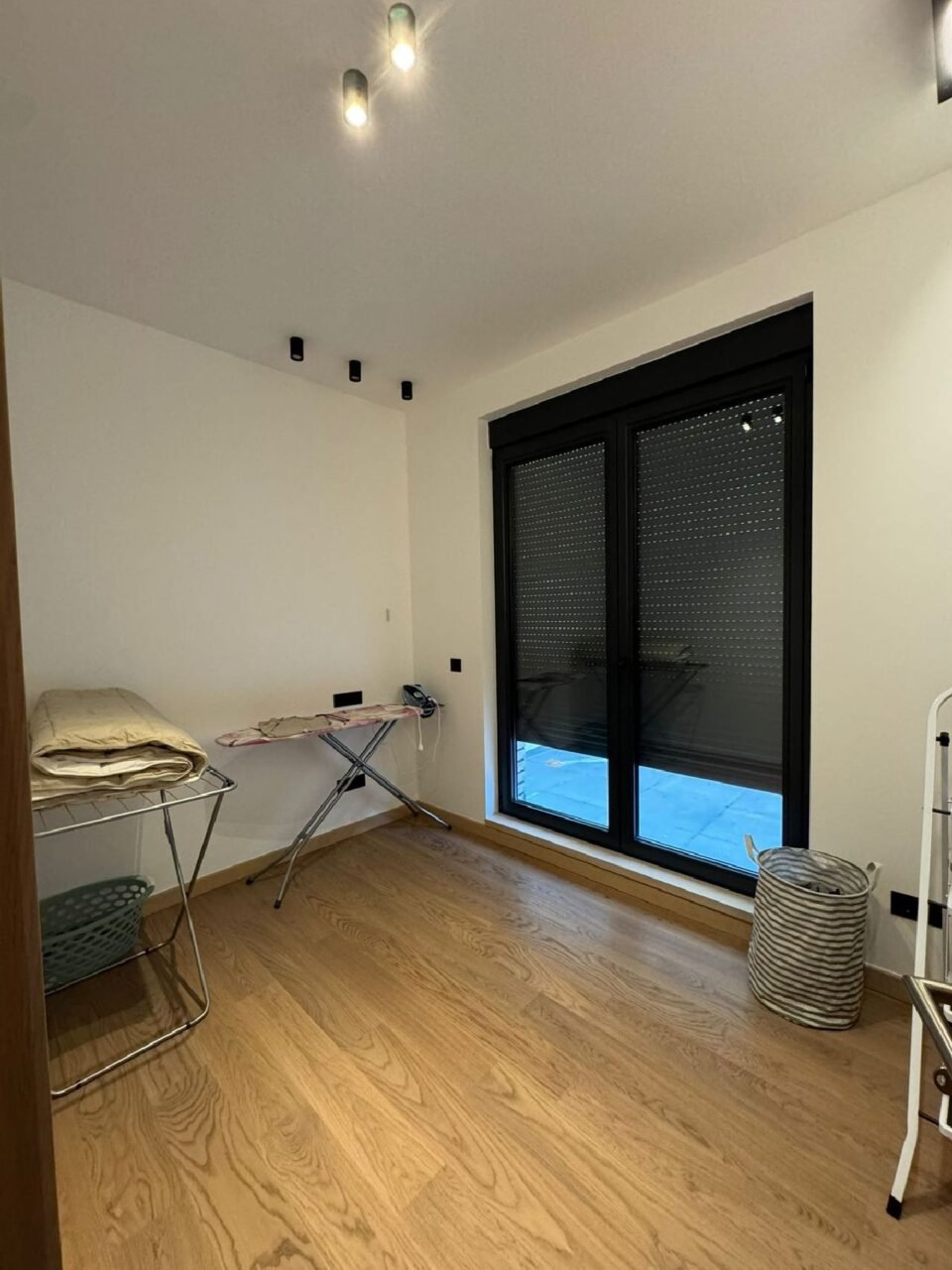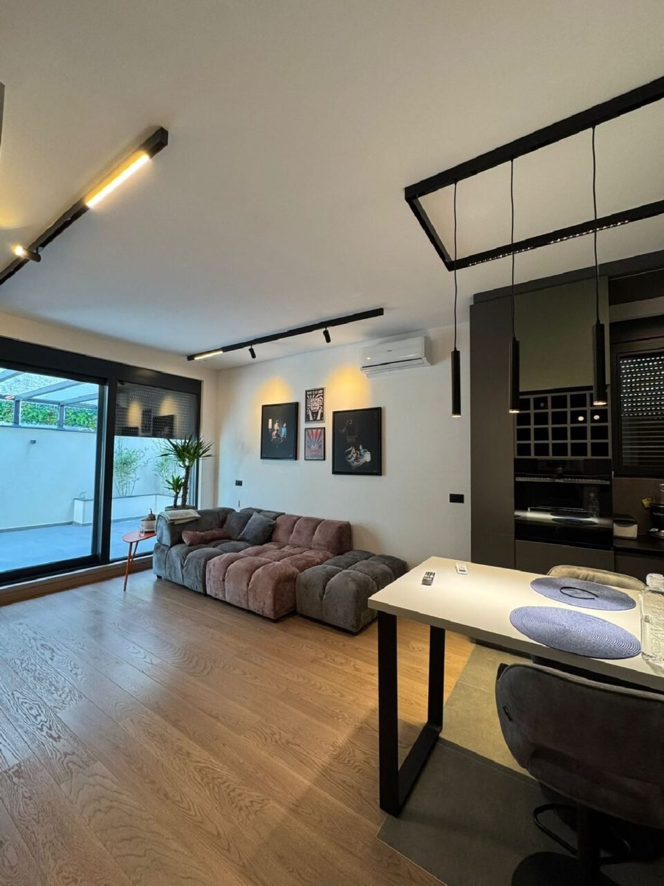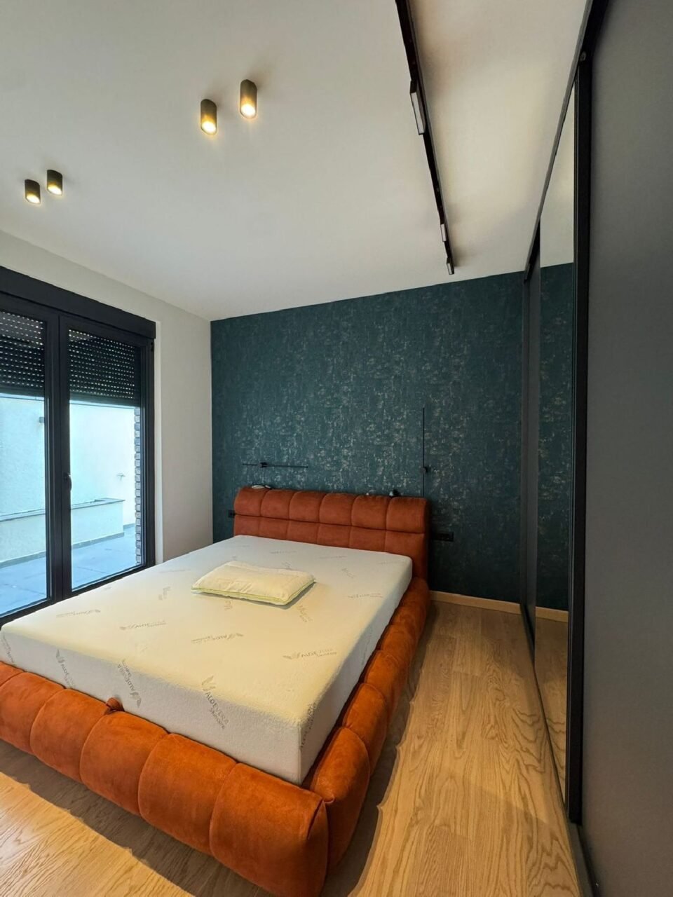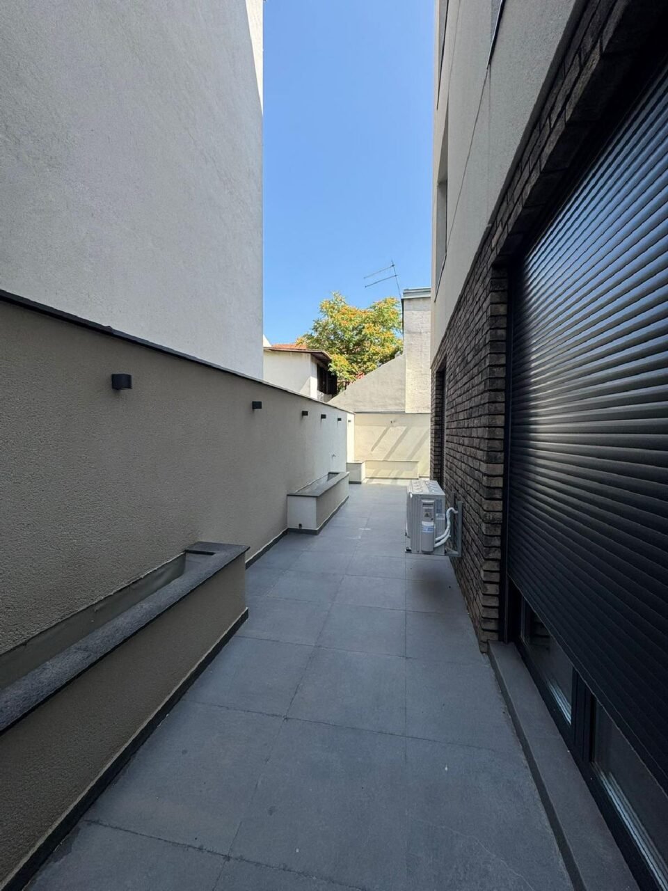 Nalazi u prizemlju potpuno nove i odlično održavane četvorospratne zgrade sa liftom i malim brojem stanova. Ono što ga čini posebnim je činjenica da je sa svih strana okružen terasom (dvorištem) od 80m², koja pripada samo ovom stanu, i koja mu pruža privatnost zahvaljujući zidu koji ga sakriva od pogleda, a na koju se može ući i spolja, a ne samo kroz stan. Stan je u perfektnom stanju, opremljen vrhunskim, luksuznim, najkvalitetnijim nameštajem rađenim po meri, Haier uređajima, troslojnom stolarijom i drugom opremom.