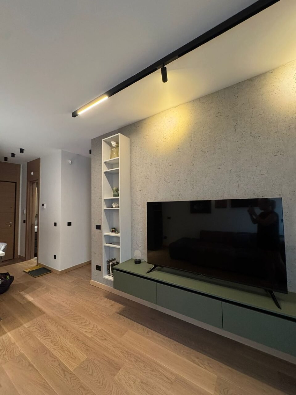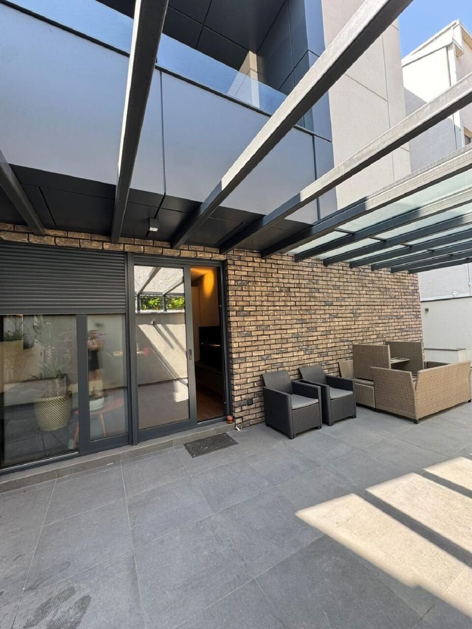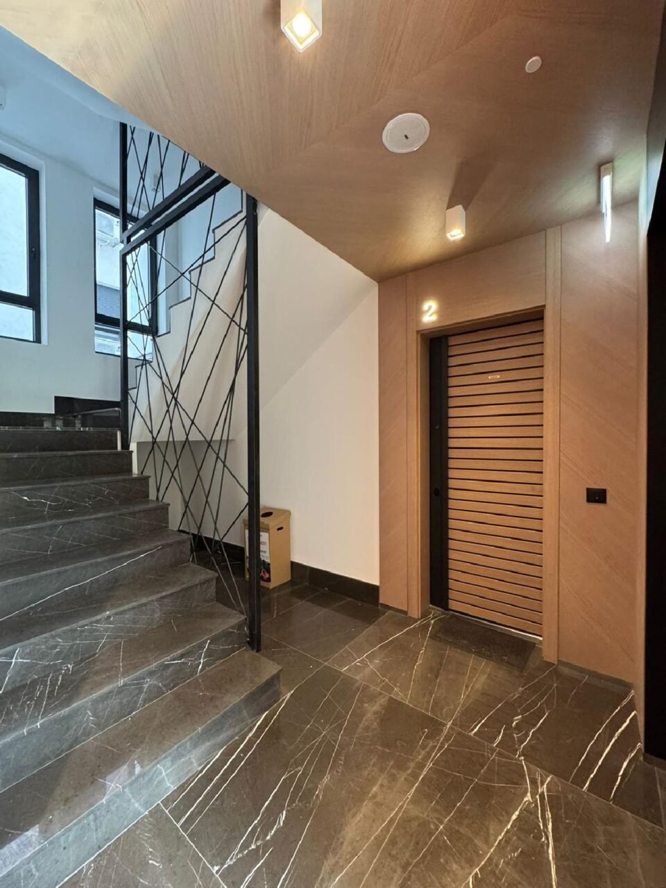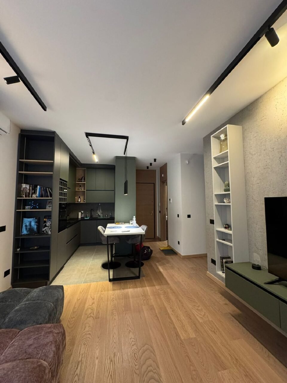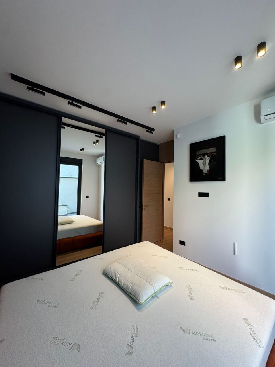 Nalazi u prizemlju potpuno nove i odlično održavane četvorospratne zgrade sa liftom i malim brojem stanova. Ono što ga čini posebnim je činjenica da je sa svih strana okružen terasom (dvorištem) od 80m², koja pripada samo ovom stanu, i koja mu pruža privatnost zahvaljujući zidu koji ga sakriva od pogleda, a na koju se može ući i spolja, a ne samo kroz stan. Stan je u perfektnom stanju, opremljen vrhunskim, luksuznim, najkvalitetnijim nameštajem rađenim po meri, Haier uređajima, troslojnom stolarijom i drugom opremom.