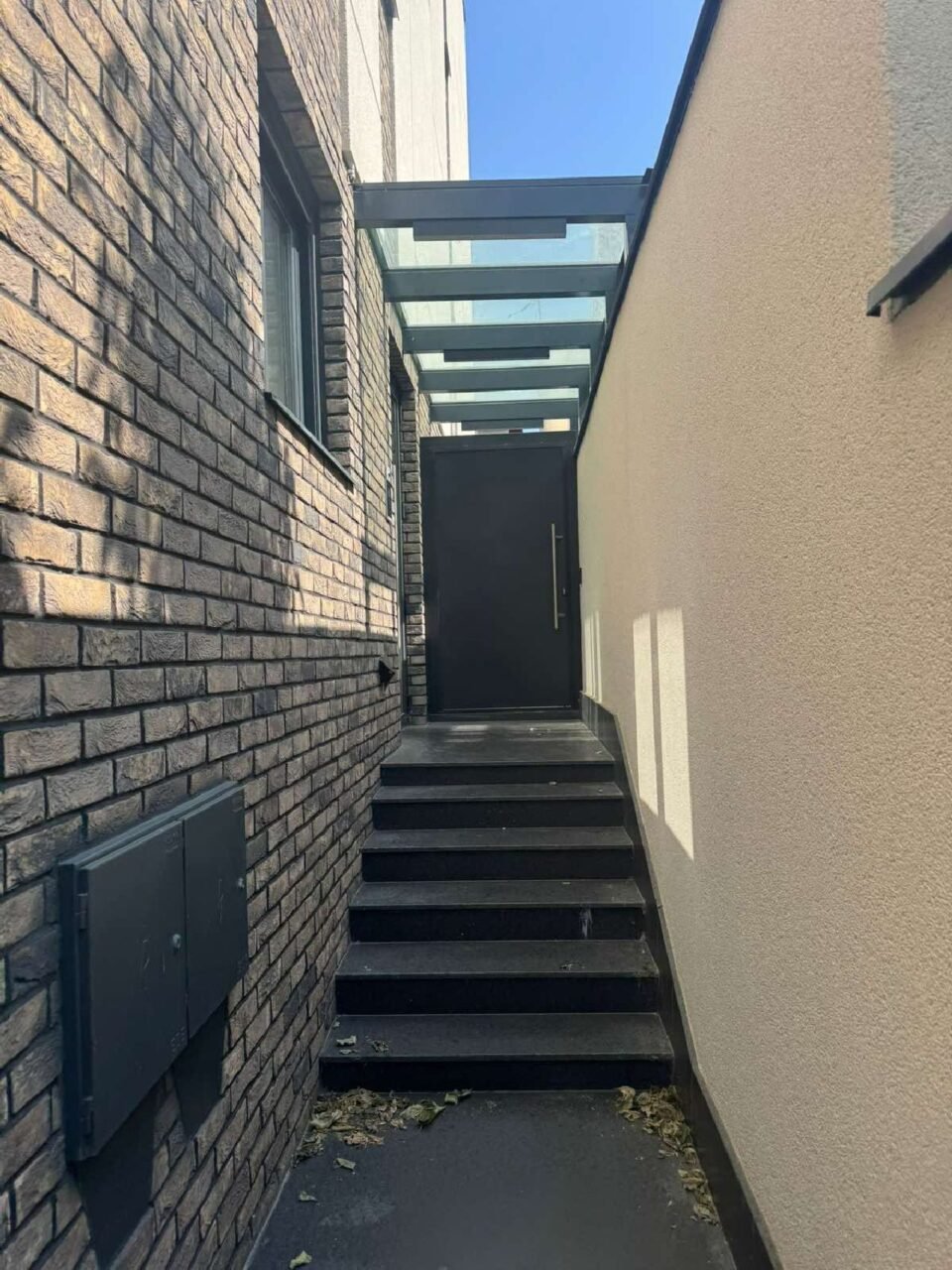 Prostorije: dnevni boravak sa trpezarijom i odvojenom kuhinjom, dve spavaće sobe (iz kojih se izlazi na terasu/dvorište, kao i iz dnevnog boravka), kupatilo, vešernica i terasa.