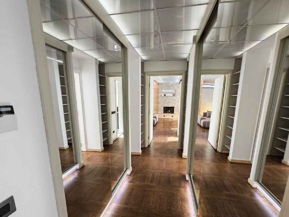 It is fully furnished with brand-new, high-end furniture and appliances: a fireplace with automatic ventilation, oak parquet flooring, Porcelanosa ceramics in bathrooms, marble details, a kitchen equipped with Bosch appliances and a granite bar, LED lighting, and black glass with electric shutters.