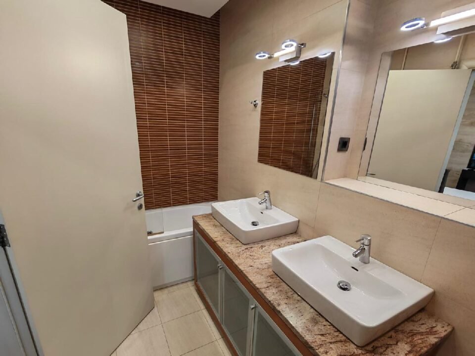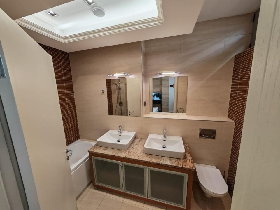 The apartment is spacious and bright, with ceiling height of 2.85 m. It consists of a living room, three bedrooms, two bathrooms, two terraces, and a storage room (12 m²) with a washer and dryer. Two garage parking spaces are included.