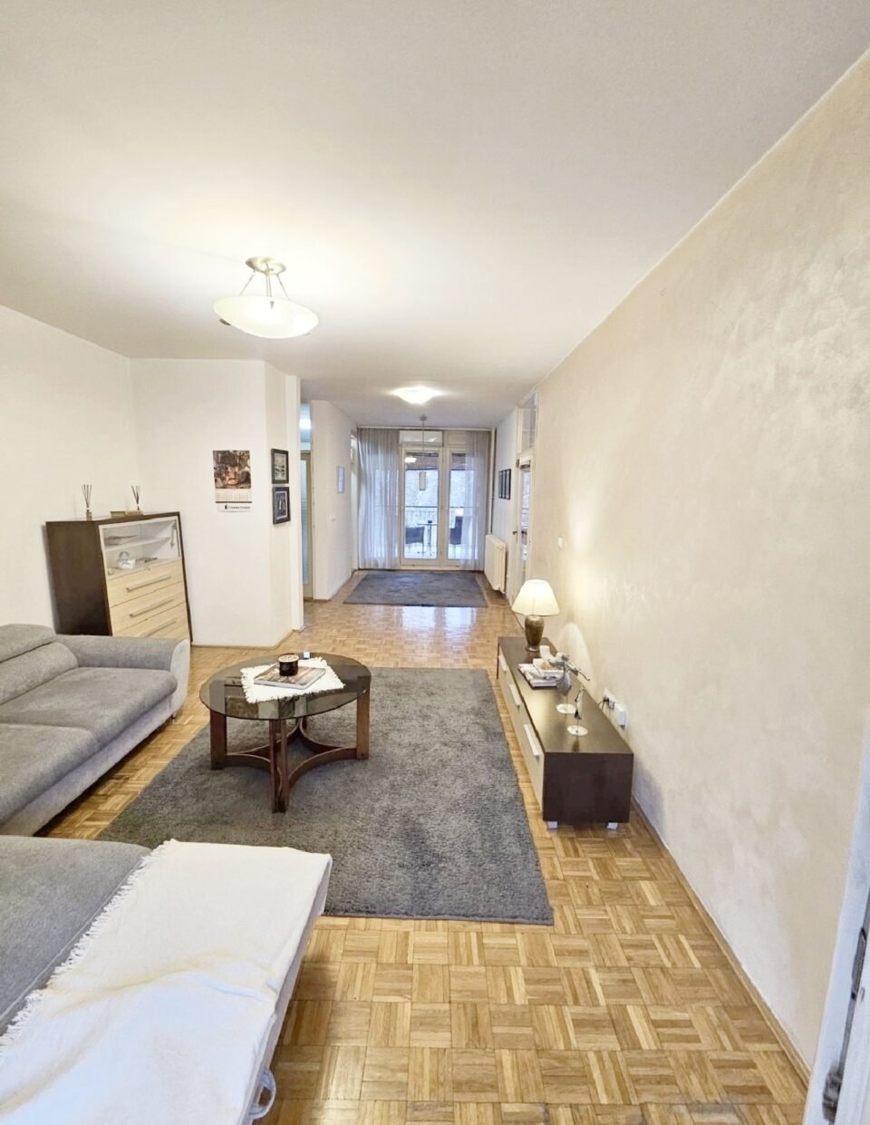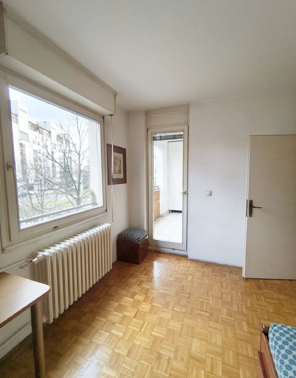 Stan je perfektno koncipiran, jer se iz velikog dnevnog boravka sa trpezarijom izlazi na dve velike lođe (od kojih je jedna orijentisana prema dvorištu, a druga prema mirnom delu Radničke ulice), ali i ulazi u odvojeni spavaći blok u kojem se nalaze kupatilo i tri sobe, od kojih se iz jedne izlazi na terasu, a iz druge na lođu.