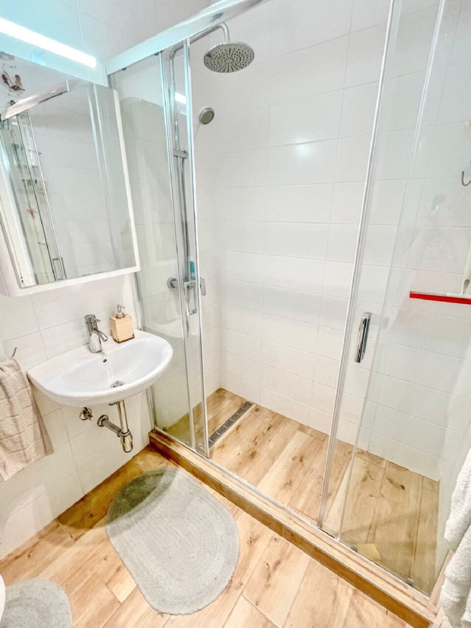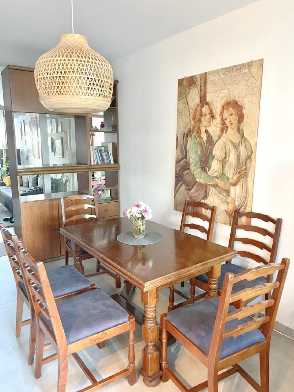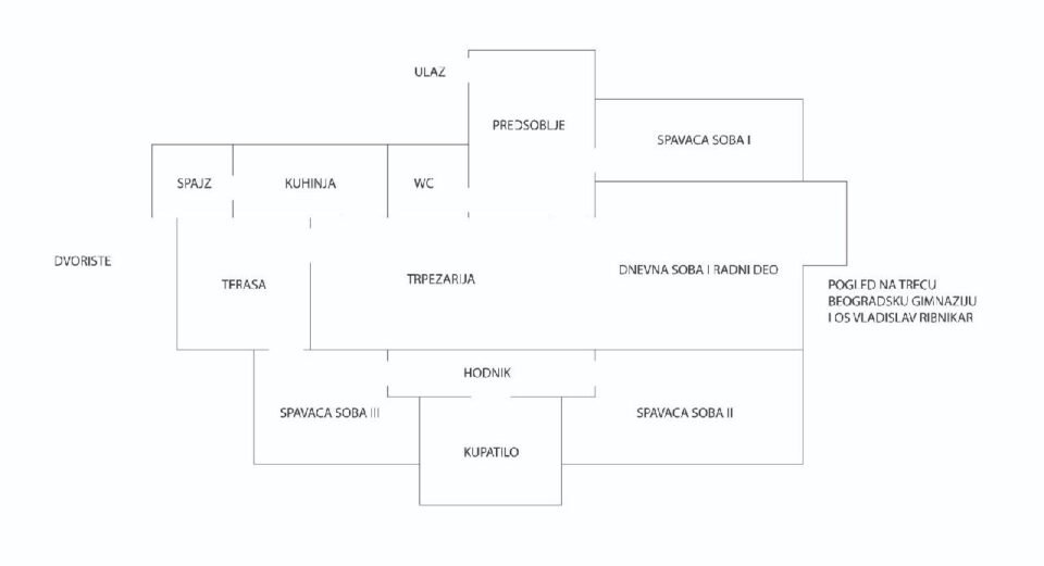 Stan ima funkcionalan raspored: ulazni hodnik, prostranu dnevnu sobu sa trpezarijom, odvojenu kuhinju sa špajzom, tri spavaće sobe (dve sa bračnim krevetima i jednu sa single krevetom), glavno kupatilo, dodatni toalet, terasu i tavanski prostor za skladištenje.