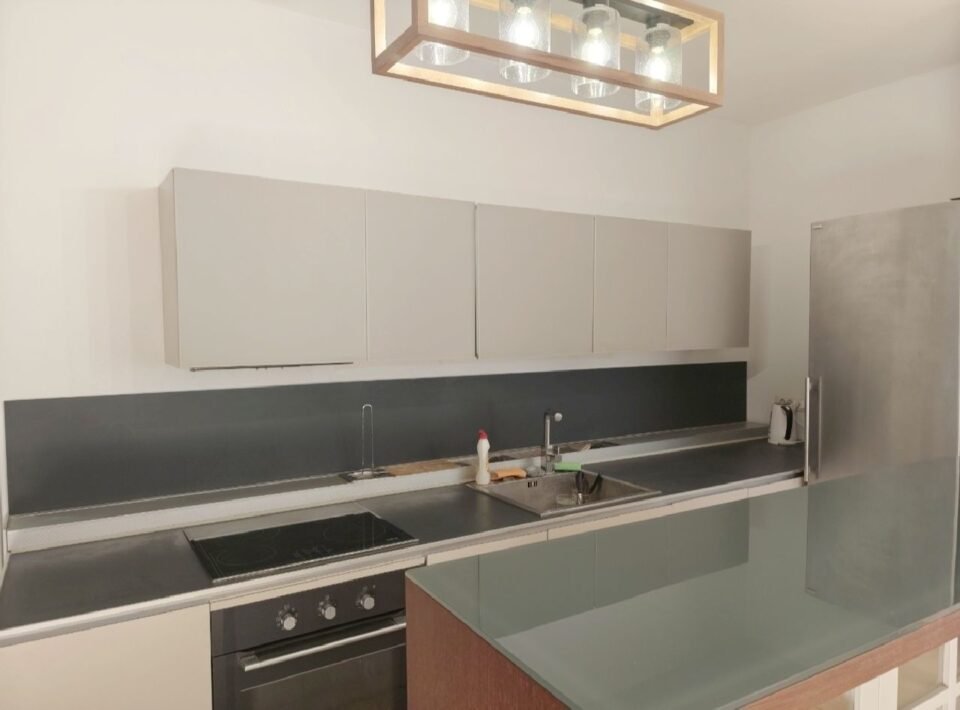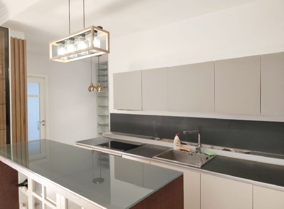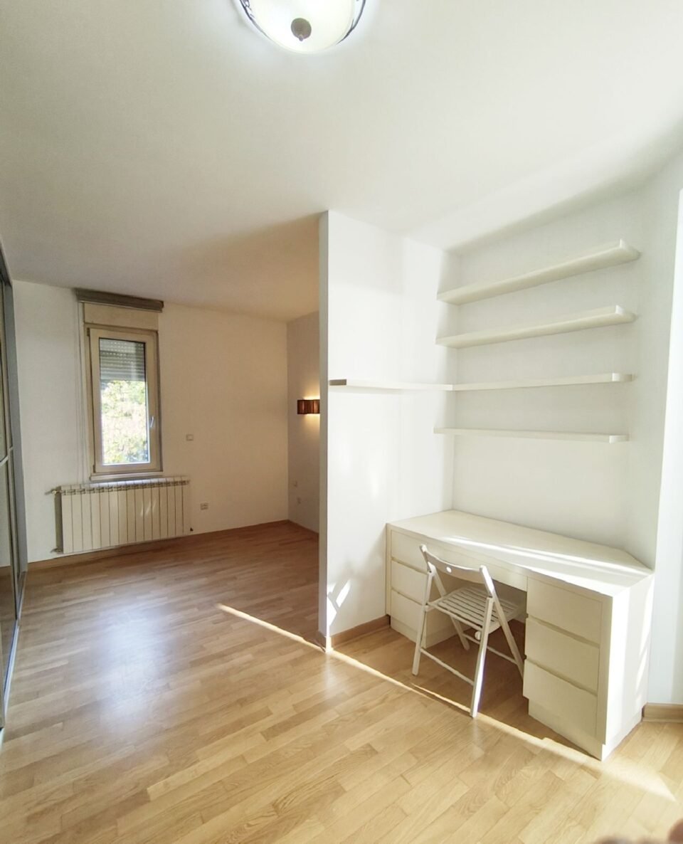 Sastoji se od prostranih hodnika, velikog dnevnog boravka sa kuhinjom, odvojene trpezarije, tri spavaće sobe, kupatila, toaleta i dve terase.