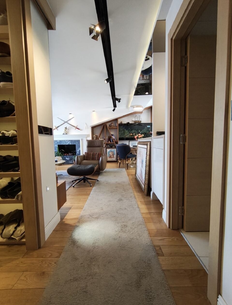 Enterijer odiše luksuzom zahvaljujući detaljima poput kamina, visokokvalitetnog ugradnog nameštaja, akvarijuma, dekorativnih staklenih površina i ogledala, kao i savremeno opremljene kuhinje vrhunskog kvaliteta.