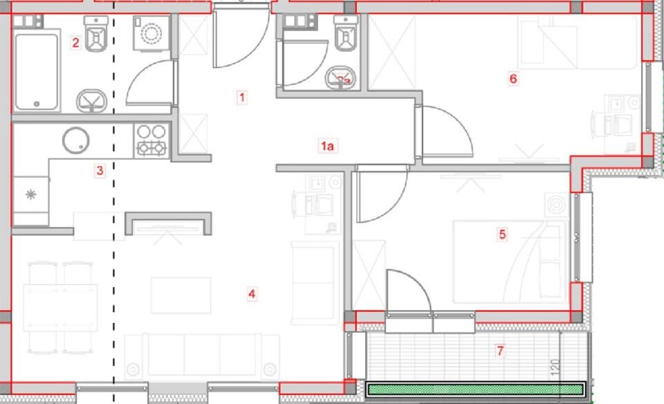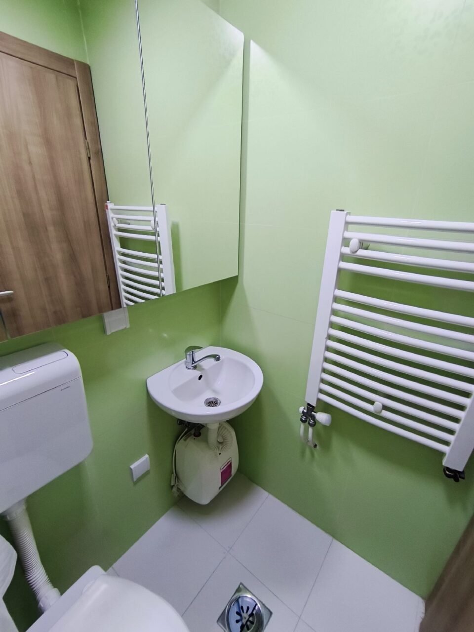 Stan ima ukupnu površinu 57 m² i sastoji se od dnevne sobe sa kuhinjom i trpezarijom, dve spavaće sobe, kupatila sa toaletom, dodatnog odvojenog toaleta, terase i hodnika. Grejanje je etažno, putem električnog kotla, uz izuzetno nisku potrošnju električne energije tokom grejne sezone. Stan se nalazi na drugom spratu od ukupno tri.