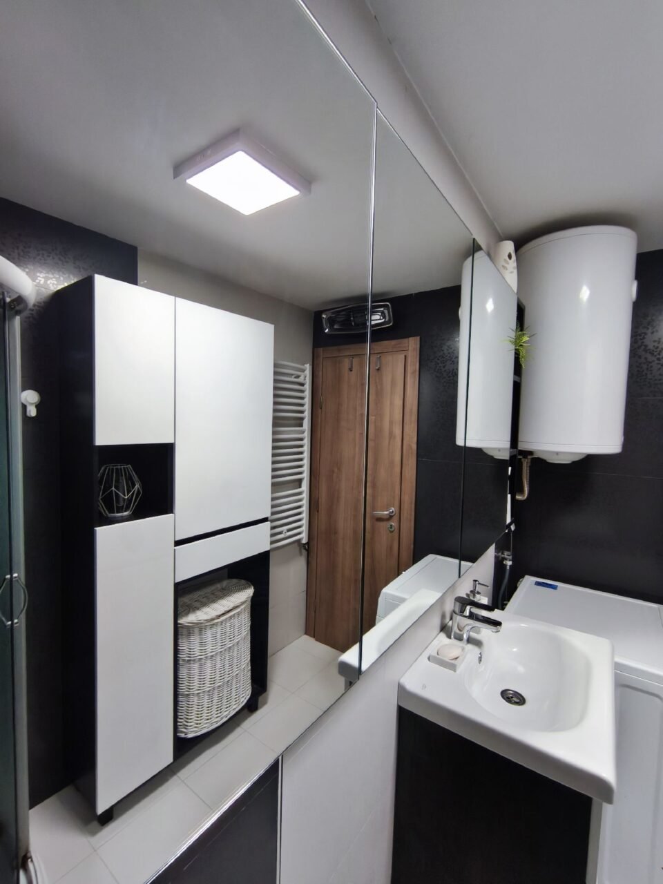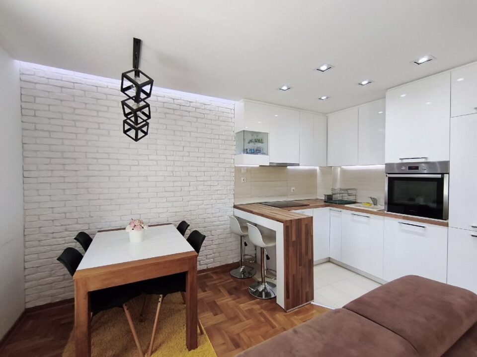 Stan se prodaje potpuno namešten i opremljen tehnikom prikazanom na fotografijama, uključujući ugradne kuhinjske elemente i belu tehniku, televizore, kao i mašinu za pranje i sušenje veša. Enterijer je pažljivo osmišljen od strane arhitekte, a gotovo sav nameštaj je rađen po meri, čime je postignuto maksimalno iskorišćenje prostora i osećaj veće prostranosti. U dnevnoj sobi, hodniku, kupatilu i toaletu nalazi se spušten plafon sa integrisanom LED rasvetom. Terasa je zastakljena visokokvalitetnim sklapajućim staklom, koje omogućava lako prilagođavanje vremenskim uslovima. Stanu pripada i plakar za odlaganje u okviru zajedničkog prostora zgrade.